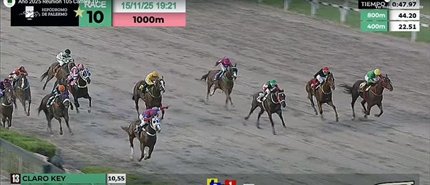 Segunda y consecutiva victoria a los 4 años y por 3 cuerpos para el encaretado Claro Key ($ 10.55-Bascuñán-Pasino, Laboulaye-Stud Dos Pasiones-Criador: La Tutina) en la 10ª prueba del programa cumplido en Palermo (15/11/25).