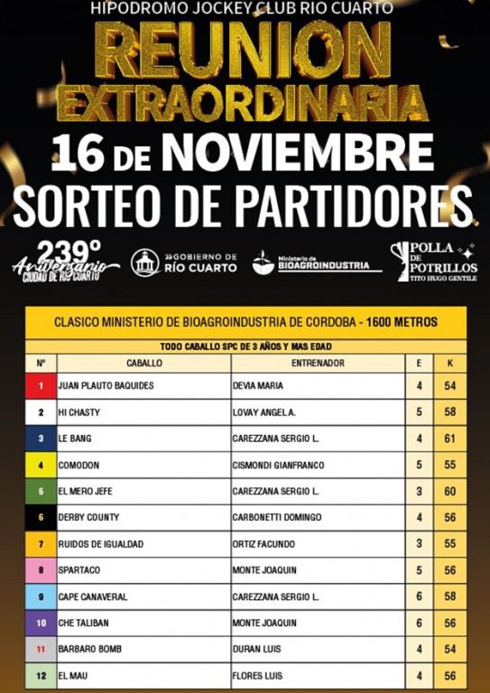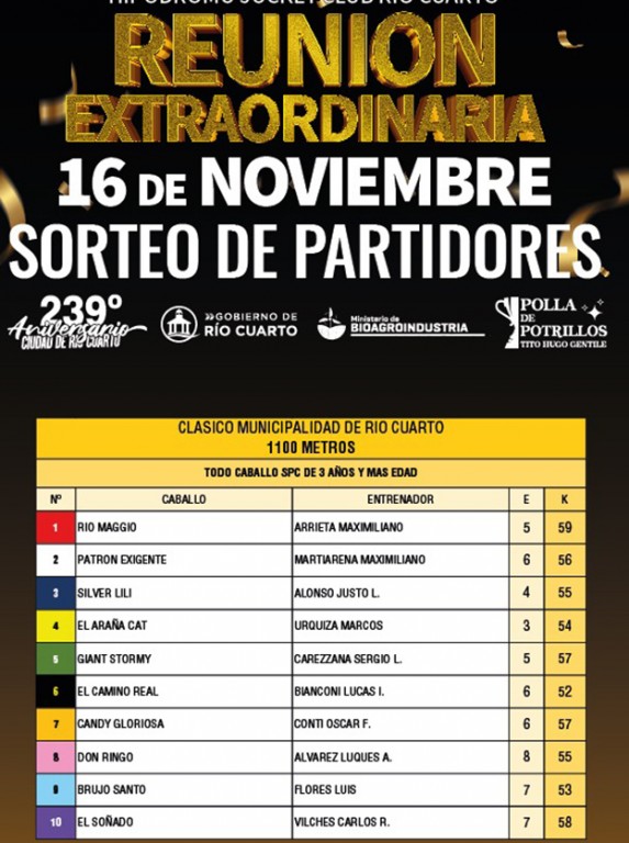 En el Clásico de la milla subirá en el villamariense Ruidos De Igualdad (Lond Island Sound), al cuidado de Facundo Ortíz y sin campaña oficial.