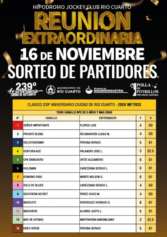 13 ejemplares fueron confirmados para el Clásico aniversario de la ciudad. Las pruebas concertadas por invitación cierran este martes 11 al mediodía