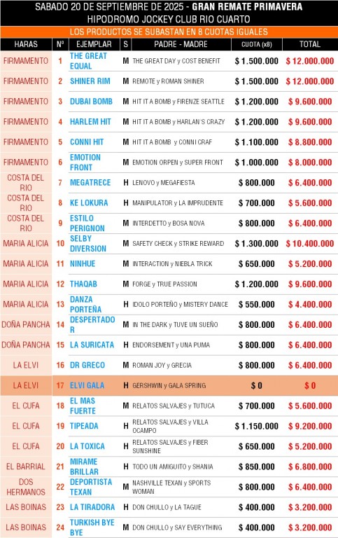 Con 24 productos nacidos en 2023 integrando el Catálogo conocido en las últimas horas, en el tattersall del hipódromo de Río Cuarto tendrá lugar el remate “Primavera” el próximo sábado 20 del corriente mes.