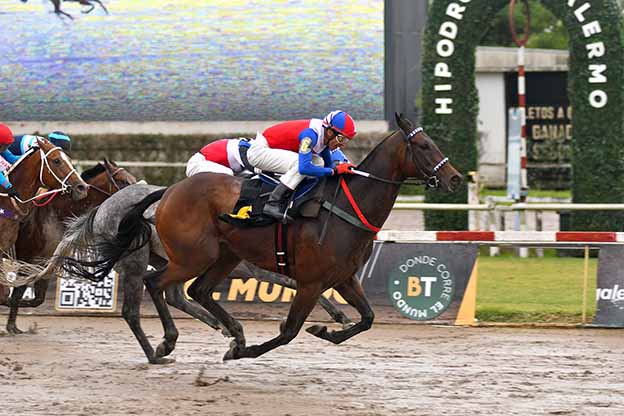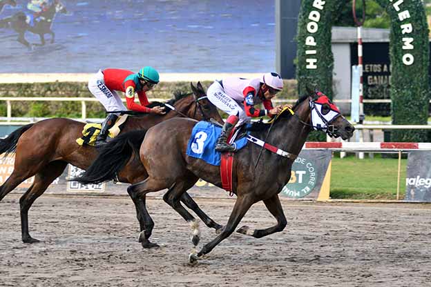Con su jinete vistiendo la blusa del Stud El Kaiser, Lissette Island ($ 7.75-Monasterolo) triunfó por 4 cuerpos en el Clásico General Guemes (10ª-G3-1000 mts) disputado en Palermo (01/12/25).