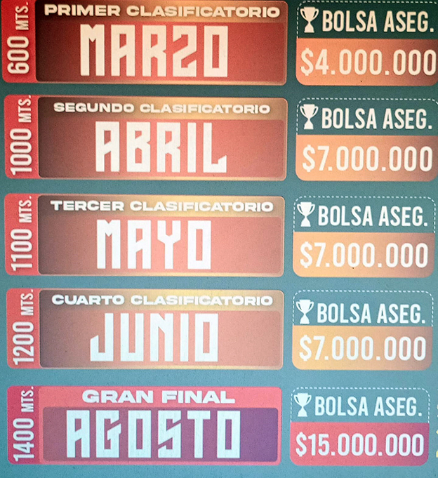 Es importante destacar la bolsa de premios en las pruebas clasificatorias y Final del año que viene, monto que asciende en total a los 40.000.000 de pesos (ver recuadro).