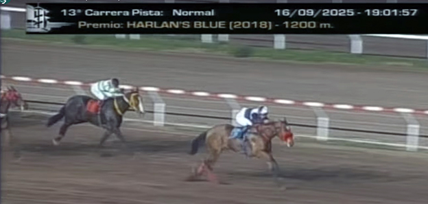 Con su piloto luciendo la blusa del Stud El Chorrito (Córdoba) de Gustavo y Gabriel Gallo y Rubén De La Mata, la yegua Pierna De Reinas ($ 4.15-Monasterolo-Acossano-Criador: Las Raíces) venció a los 4 años por medio cuerpo en la 13ª carrera de San Isidro (14/09/25).