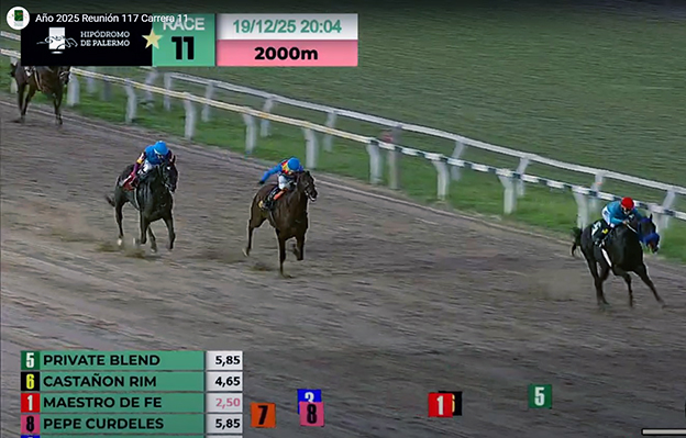 El caballo Private Blend ($ 5.85-Borda-Recabarren, Río Cuarto-Stud Don Cato-Criador: Rodeo Chico), ganador del último clásico aniversario del Imperio, alcanzó la segunda victoria oficial de su campaña al vencer por 6 cuerpos en la 11ª carrera de Palermo (19/12/25).
