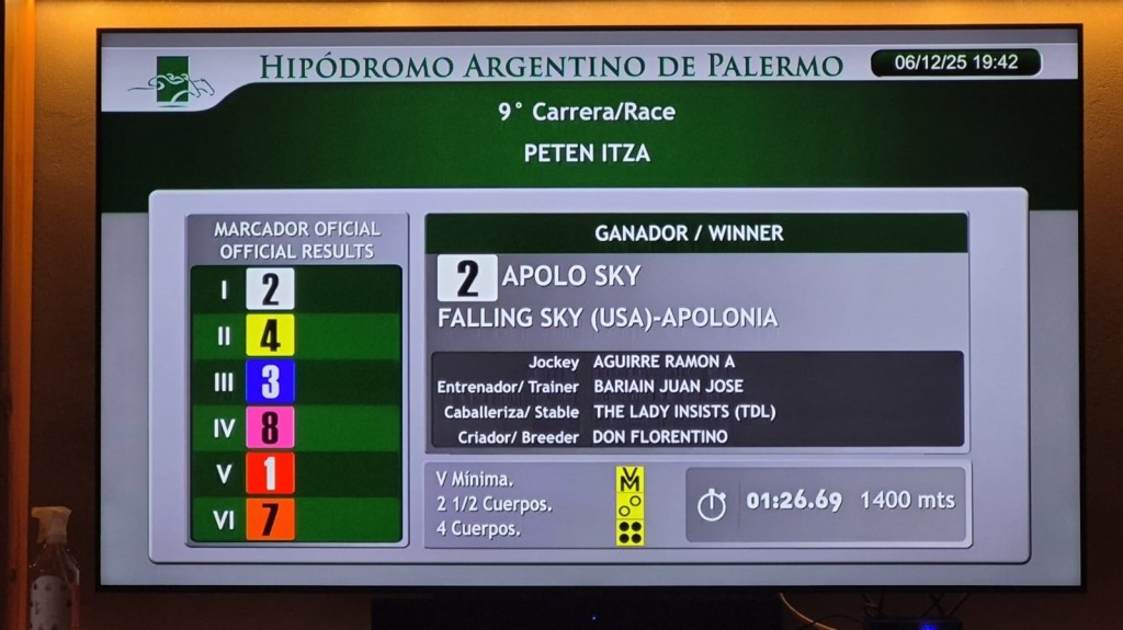 El caballo Apolo Sky ($ 4.35-R. Aguirre-J. Bariain-Stud The Lady Insists, Tandil) venció por ventaja minima en la 9a carrera.