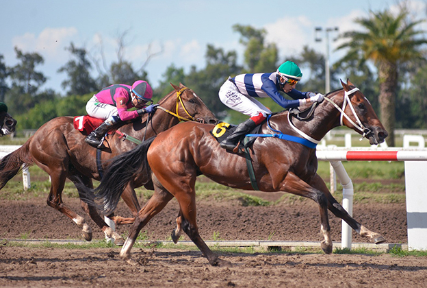 Con su jinete luciendo la blusa del Stud Los Betos (Rosario), la yegua Exactly Right ($ 2.10-Peralta-Scarpello-Criador Abolengo) triunfó a los 4 años y por 5 cuerpos en la prueba inicial.