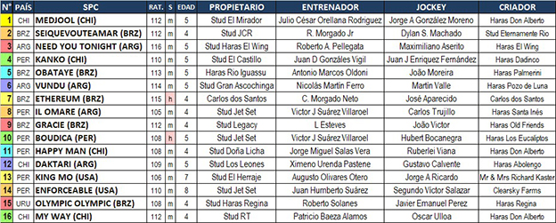 El caballo brasileño Obataye ($ 10-sport de SI-Stud: Haras Rio Iguassu-Criador: Haras Palmerini) derrotó de atropellada y por un cuerpo y medio al chileno Medjool en el GP Latinoamericano (G1-2000 mts) disputado en el hipódromo de La Gávea (Brasil.