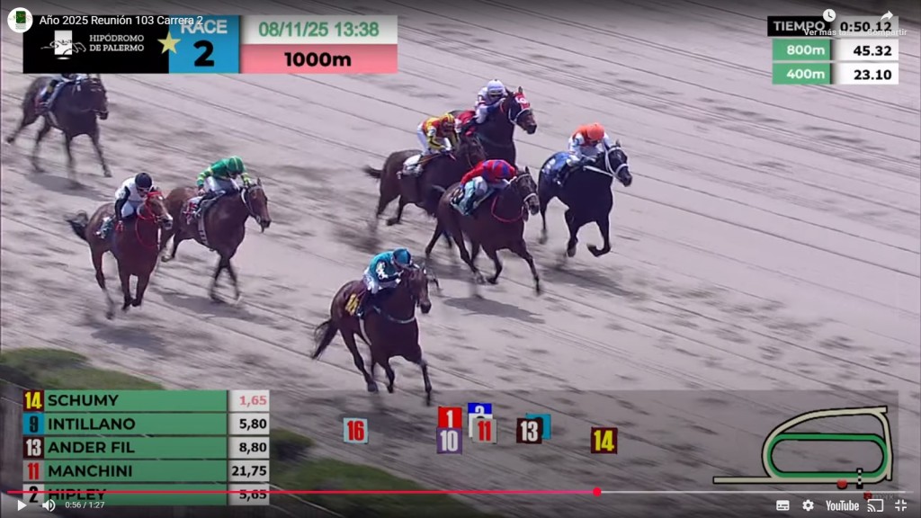 A los 3 años y representando al Stud Fredi, de Fredy Vittorelli (Laboulaye), Schumy ($ 2.30-B. Enrique-A. Pereyra, La Cesira-Criador: El Paraíso) triunfó por 4 cuerpos en la 2ª carrera de Palermo (08/11/25).