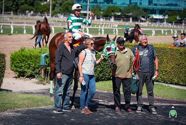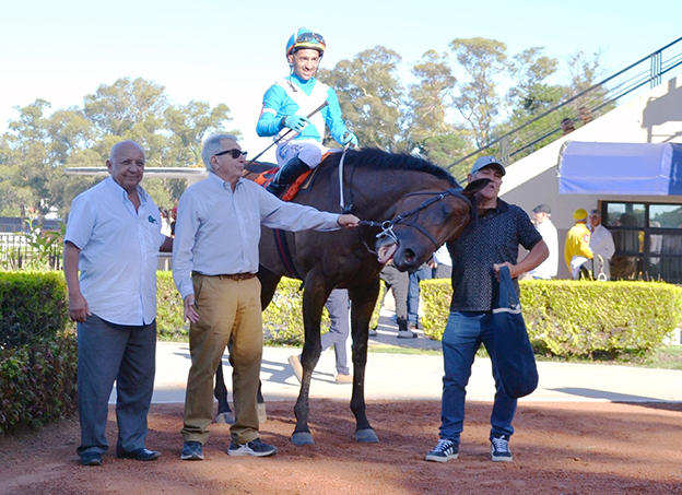 Con el jinete santafesino luciendo la blusa azul y roja del Stud Dos Pasiones (Serrano), el hijo de Claro Oscuro y Agustina Key (Key Deputy) es preparado en realidad por César Peralta (San Francisco).